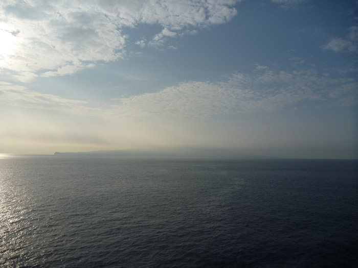 そして、さらに次の朝。デッキへ出てみると見覚えのある島影が見えています。伊豆大島。波待ちしている沖にいつも見えている島です。