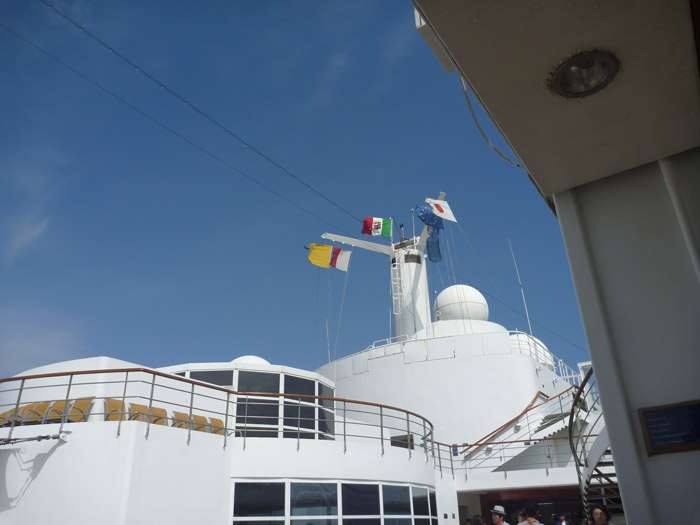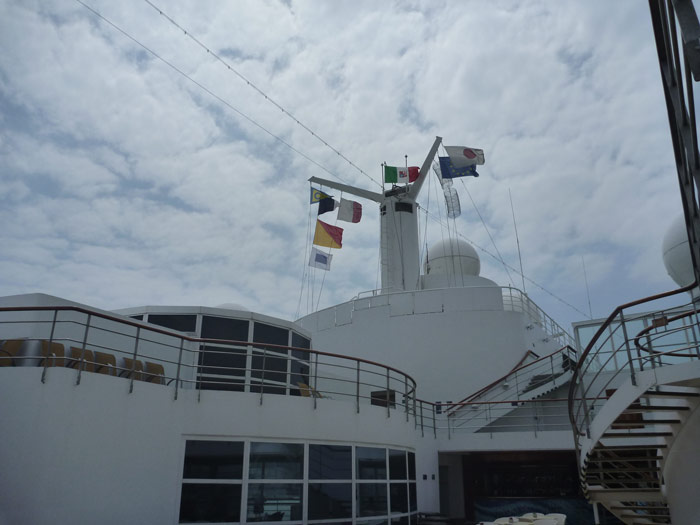 今の時代、旗を使って周囲に信号を送るのはとてもアナログなことのように思えますが、私にはとてもドラマチックに感じられて、(千数百人いる乗客の中でおそらく)ひとりで感動していました 笑。