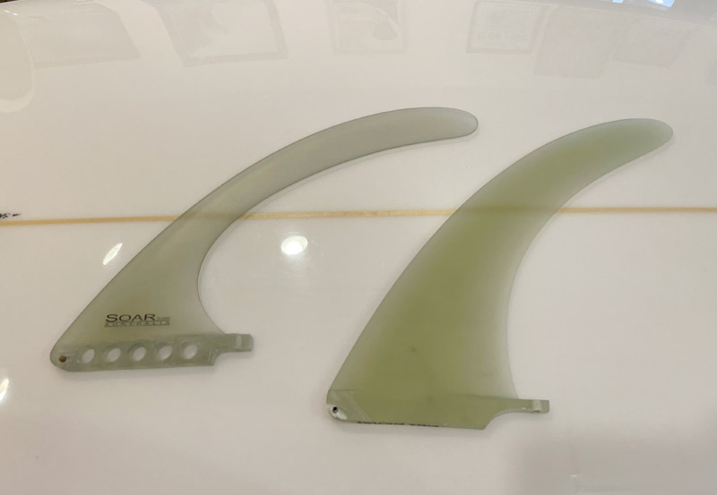 面白いことに、左のニーボード用のフィンはVEEボトムに使っても調子良いみたいです。高さは9インチより少し低く、全体で細いので面積も小さいです。それでも機能するのは、後方へ大きくレイクした部分がポイントなんでしょうね。