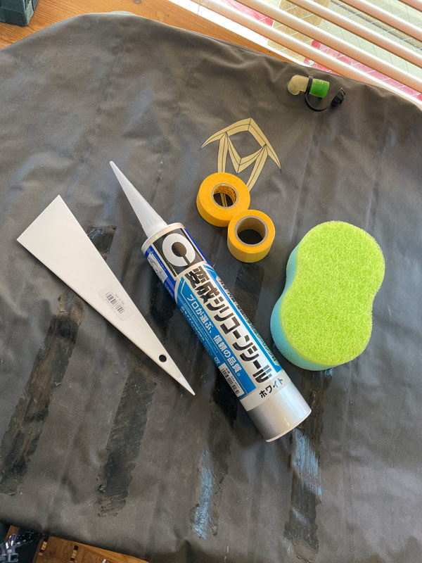 もうひとつはマット。滑り止めを新しくしようと材料を仕入れてきました。コーキング材にマスキングテープ、スポンジです。