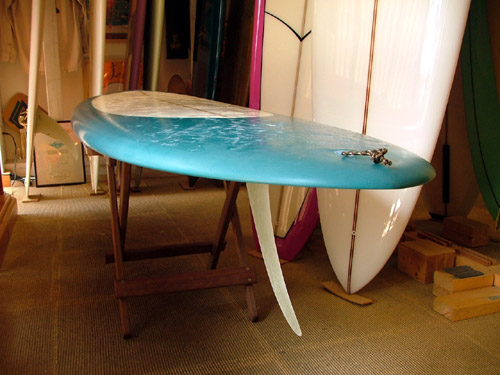 ショップのオープンは2001年。それ以来、ロングボードをベースに、フィッシュ、ボンザー、シングルフィン、ニーボード、パイポとさまざまな種類のサーフボードを作り、試してきました。