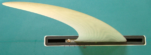 そしてボランクロス積層のフレックスフィンのラフな質感も最高。細長いフィンって昔から大好き。お手製のフレックスフィンは市販のフレックスフィンとはかなり違う感触。マスプロダクトには無いそんなカスタムの感覚もうれしくなります。フィンの位置が判らなくなるので、目盛りを書き込んでいます。いまはテールから13インチ。前寄りについている細長いフィンの独特のバランスにもうれしくなります。