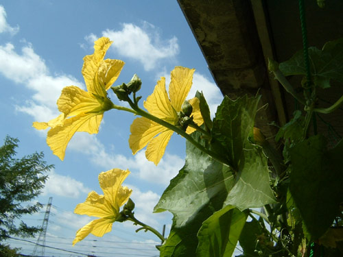 いい天気ですね。ベランダのナーベーラ(へちま)の花が満開です。実もうまく成ってくれると嬉しいんですが…。