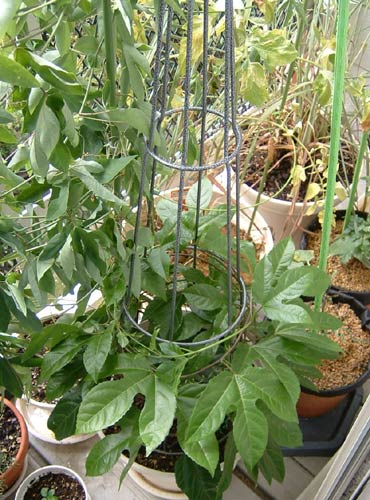 これはトケイソウ、手前がクダモノトケイソウ(パッションフルーツ)と奥は花だけのトケイソウ。