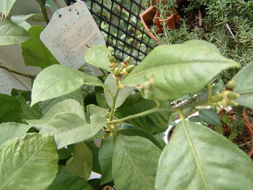 レモン。花が咲いているときにはさかんに蜂がやってきて花をつついていたので、きっと実が成ることと思います。小さいのが全部レモンになるのかな?