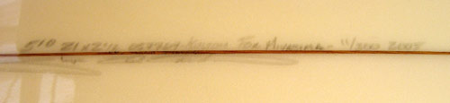 写真は私のフィッシュにあるクリスのサイン。KUSTOM FOR 「私」で、シリアルナンバーが2005の300本シェイプのうちの11番目です。クリアでロゴもなし、シェイプサインのみのシンプルなフィッシュ。クリスもニクイことしてくれます。しかし、クリスとカツさん、自分自身が楽しめるボードを作ってくれるシェイパーと出会えた私は幸せです。