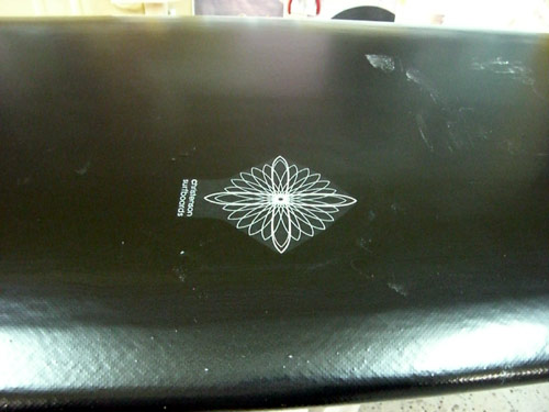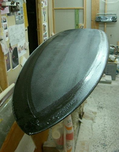 黒いボディにクリステンソンサーフボードのロゴがきれいに映えています。赤いフレックスフィンがテールから8インチのところにグラスオンされる予定。