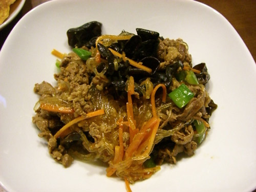 ニシオカさんにコメントをいただいたので食べ物写真のオマケ。チャプチェ風のはるさめの炒めもの。メネフネ料理教室でもやりましょうか。