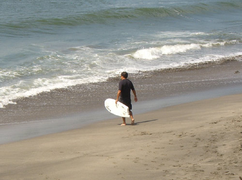 着替えていると池田潤さんが新しいイクイップを見せてくれました。名前は忘れましたが、ボディボードに小さなシングルフィンが付いたボードでした(スタンディングで乗ります)