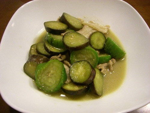 庭に植えていたナーベーラー(沖縄のへちま)がようやく実を付けました。さっそくナーベーラーンブシー風に料理してみました。一緒に入っているナスも自家製です。