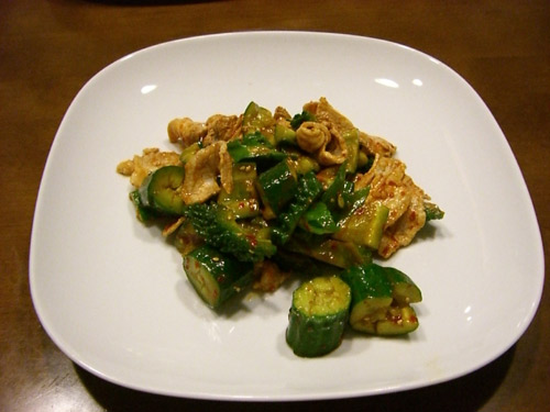 こちらも庭から、シカクマメ(うりずん)とキュウリ、ゴーヤとンブシーで使った豚肉を醤油とゴマ油、豆板醤で和えました。んまいです。
