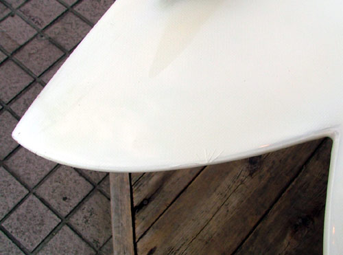 ラミネートのクロスまでは達していないキズなので、クロスは使わず樹脂だけでリペアできます(これが「簡単にできます」と書いた理由)このキズでフォームまで浸水することは無いのですが、そのままだと海水が入ってヒビの部分が黄色くなったりします。