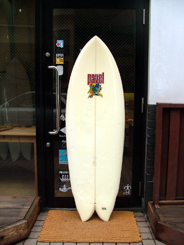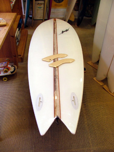 続いてやってきたのは、ご先祖代々伝来のミランドンサーフボードのツインピンフィッシュ。アガベウッドのストリンガーです。