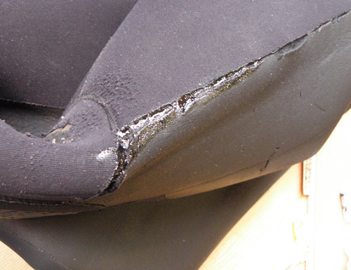 まずスキンとジャージの継ぎ目。盛大に剥がれていますが、作ったばかりのウェットでも一番壊れ易いのがココです。ジャージ同士なら縫い合わせることができるのですが、スキンとジャージは表面は縫うことができず、縫うのは裏面だけで表は接着だけになってしまいます。脱ぎ着のときにいつも引っ張っていると開いてきてしまうので、一番丁寧に扱わなければいけない部分です。別に頼まれた訳じゃありませんが、ここもくっつけることにしました。気になっちゃうでしょ。