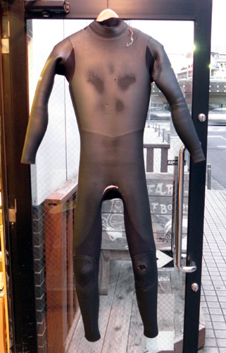 リペアのウェットスーツが持ち込まれましたが、脇の下は破れ、ムネの生地も敗れ、正直言って大変な状況。股の部分と背中のファスナーの下に空いた穴の補修とのことでしたが、そこをふさいだとしても他にも穴はあるし、生地が薄くなっていて試しに水をかけてみると内側までどんどんと沁みてきてしまいます。