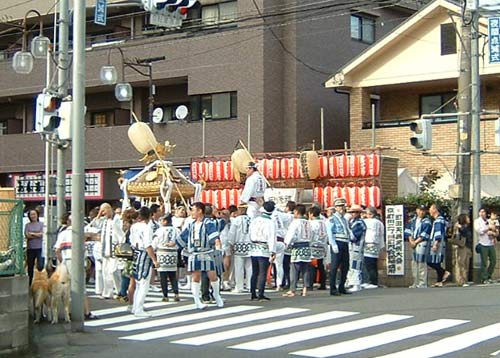 神輿が次々とやってきます。わっしょい、わっしょい賑やかです。左側にお尻が見えている二匹の日本犬は近所に住んでいます。たまに散歩していますが、すごくかわいい二匹です。実は日本犬と三毛猫が大好きなメネフネさんです。来年は柴犬を飼いはじめようと思っています。