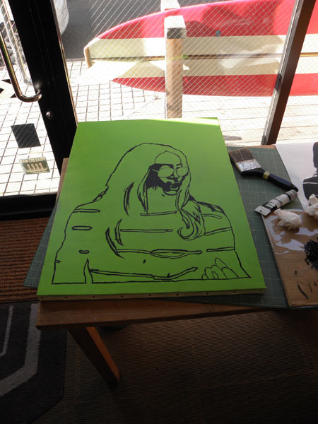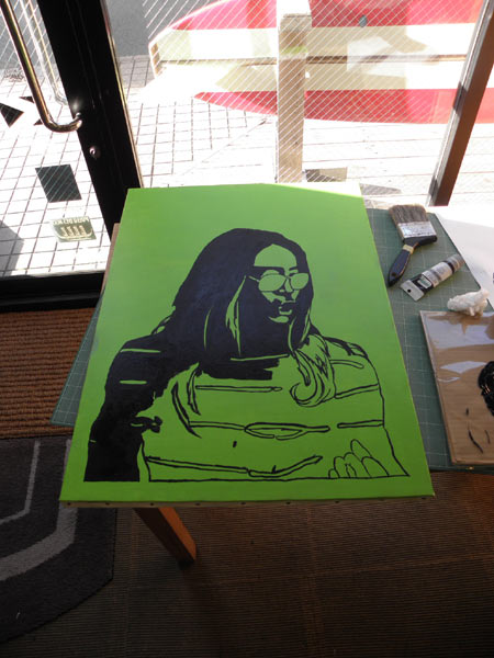 グリーンに塗ったキャンバスにカツさんを描いて、黒の絵の具で塗っていきます。実は一度失敗してグリーンで塗りつぶしてます。