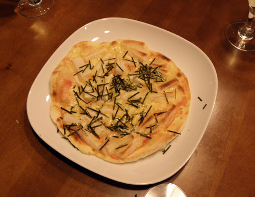 まず一枚目。具はモチ、チーズ、メンタイコ。仕上げに海苔をぱらり。焦げ目が美味しそう。