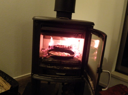 ピザ生地は3つに切って、麺棒を使って丸く伸ばし具を乗せてストーブの中に突っ込みます。すごい熱なので耐熱手袋が必要です。夏場はできません。