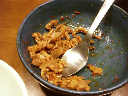 スープを取ったあとのスジは捨てたりしません。細かく切って、豆板醤とゴマ油と醤油で味付けして酒の肴です。コリリと旨いすなぎもでした。