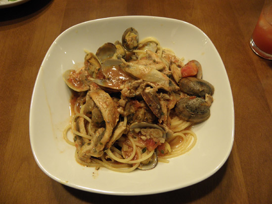 お約束通り、昨日のイワシのパスタ。あさりを加えてトマトソース仕立てにしました。