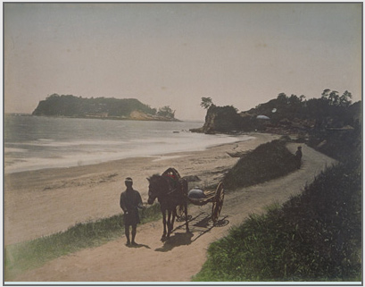明治時代の江ノ島です。江ノ島の手前に小動岬と腰越の集落が見えています。馬車が通る海沿いの道はさしずめ134号線か。