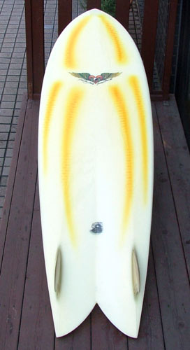 ディック・ヴァン・ストラーレンのフレッシュフィッシュがまず1本。ユーズドです。5.11 ボトム&デッキコンケーブ、ストリンガーレスのフレックスフィッシュ。