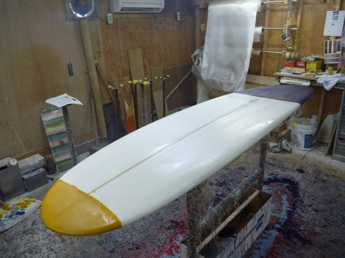 ファクトリーでは、カスタムボードの制作がすすんでいます。Mさんの8フィート、ノーズライダー。カラーばっちり仕上がっています。