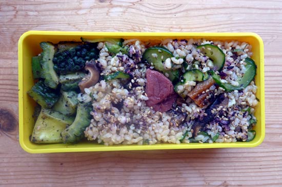 今日はちらし寿司。梅干しを作るときに出来た梅酢で酢飯を作って、具材は甘辛く煮た干し椎茸、塩もみキュウリ、焼あなごに刻んだミョウガ、シソを混ぜて、仕上げにいりゴマとお手製ゆかりをパラリ。付け合せはフライパンで焦げ目をつけたゴーヤとオクラ。