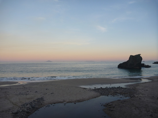 そして人影がすっかりなくなった夕暮れの海。遠くには残照に照らされた島々がぼんやりと浮かんでいます。海は凪いで背後にせまる山からはヒグラシの声と涼しい風が吹いています。