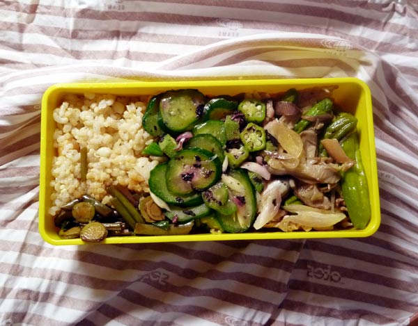 玄米と雑穀、豆ごはん、キュウリとオクラとミョウガの酢の物、豚肉とシイタケ、シシトウのショウガ風味焼、そしてわさびのしょうゆ漬けです。旬の食材を使ってざっと数えて食材だけで12種類です。