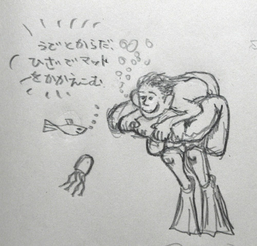 スープが迫ってきたときや方向を変えたいときの体勢です。両手でノーズ側を持って身体を折り曲げ、ヒザからマットを抱え込むようにします。スープにマットを持っていかれないように抱え込んで、通り過ぎたら身体を伸ばしてキック再開です。方向は瞬時に変えられます。