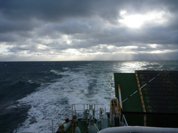 船酔いするかと思いましたが平気で、揺れにも慣れてきたので外のデッキに出てしぶきをかぶっていると、風はだんだんと収まり空を覆っていた厚い雲の間から日が差し始めました。天気予報は強風雨のち晴れ。