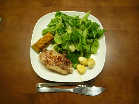 お肉と野菜のプレートにもカボチャが登場。クリは先日のブログで登場した剥き栗。皮をむいて冷凍していたのをオーブンでお肉の横で一緒に焼きました。