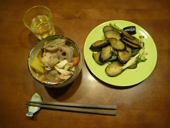 芋煮です。サトイモも旬。焼いたサツマイモも芋煮に参加しました。秋茄子とやわらかいネギを油でいためてショウガ醤油で味付け。美味いです。