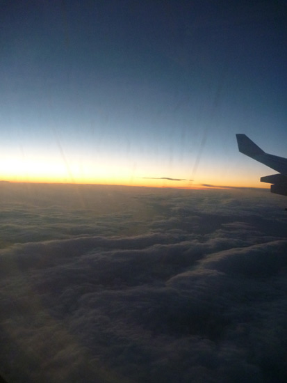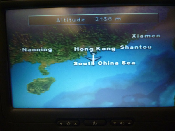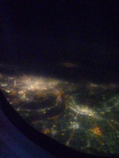 大きな街の光が見えるたびに座席それぞれに備え付けてあるフライト情報を見てそれがどこの町なのか確かめます。最初は中国海南島。インドのニューデリーは街の明かりが飛行機の翼をオレンジ色に染めていました。