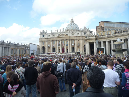 まずはカトリックの総本山、ヴァチカン市国へ。この日はちょうど日曜日。ローマ法王みずからのありがたい説教です。それにしてもすごい人出です。