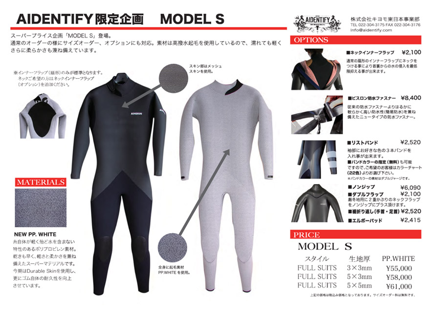真冬のウェットスーツに欠かせない暖かさと耐久性という機能をキープしつつもAIDENTIFYさんのご協賛で、¥58.000という価格を実現いたしました。5/3mmでもちろんフルオーダーでの価格です。