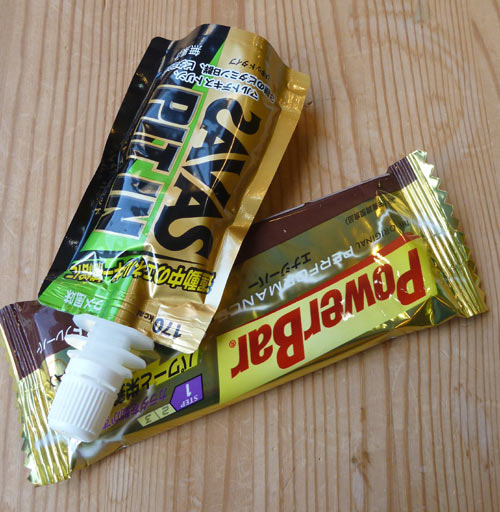 私は長い時間走っていると腹が減ってパワーダウンする体質なので、ジェルだけでなく固形燃料も必要です。どのタイミングで補給するかも重要です。