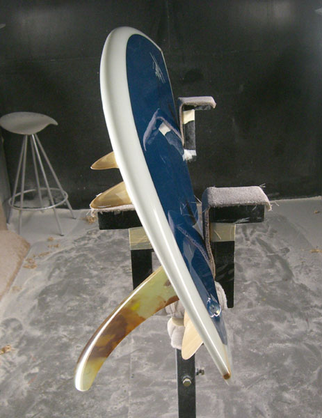 70年代に作られていたオリジナルのボンザーのサイドフィンは細長い三角形のものが左右にひとつづつ付いています。それを二つに分けて小さい三角形のフィンが前後に付いています。