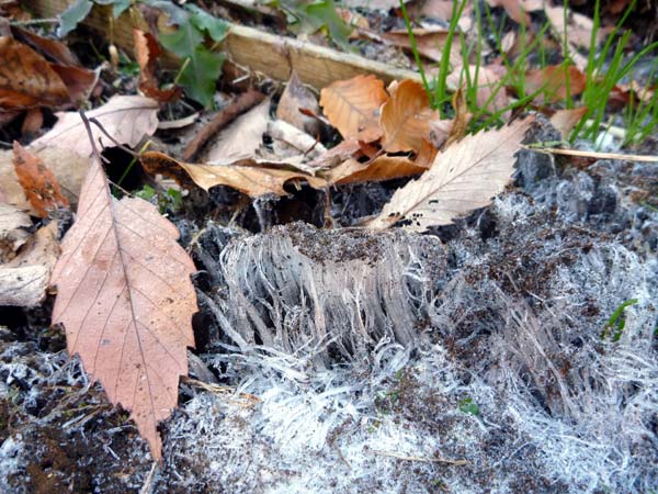 一夜明けてみれば、外はホワイトクリスマス。雪じゃなくて霜で真っ白になってました。霜柱です。