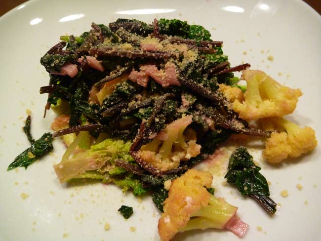 付け合せは温野菜サラダ。生の葉っぱのサラダが大好きですが生野菜は身体を冷やすので冬場は冬の野菜に火を通して温野菜サラダで食べるのが最近のマイブームです。フライパンにオーリブオイルとニンニク入れて火にかけて香りを出して好きな野菜を入れます。野菜にざっと火が通ってきたらクリームチーズをいれて溶かしながら混ぜ合わせて出来上がり。