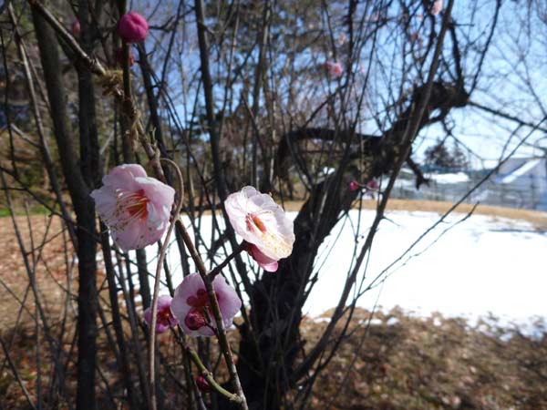 八重咲きっぽい梅の花もほころんでいますが、バックには雪が…。近所の梅を見ていると、もっと濃いピンク色の紅梅は1月中旬ごろから咲き始め、白梅はその後の1月下旬ごろからちらほらと咲き始めて、この淡いピンクの紅梅が一番遅く咲きはじめるみたいです。