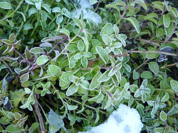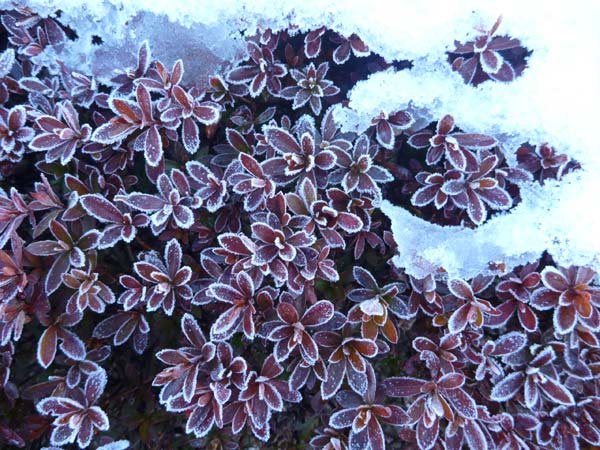 我が家の回りはまだまだ雪と氷がたっぷりです。日陰の葉っぱは凍り付いています。