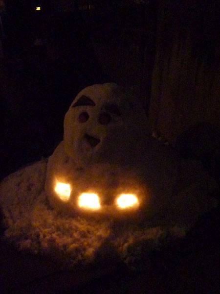 これは昨夜の写真。昨日のブログでご紹介した雪だるまにロウソクをともしてみました。なかなかきれいです。