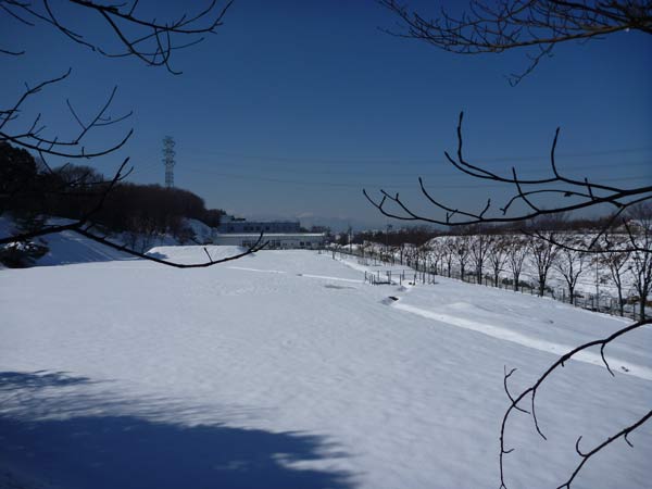 こういうのを見ると、ワーっと走っていって足跡つけて転がりたくなりませんか?ここに住んでいてたまにみかける雉はどうしてるいるかな?遠くに白く富士山が見えています。