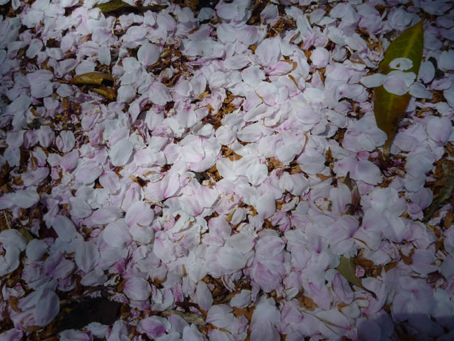 散る桜、散った桜もきれいなものです。薄いピンク色の雪が積もったようにあちこちで地面を覆っています。