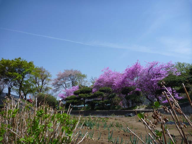 畑の脇のピンクの花は野生ツツジかな?その向こうには葉がではじめた桜の木。空がきれいです。