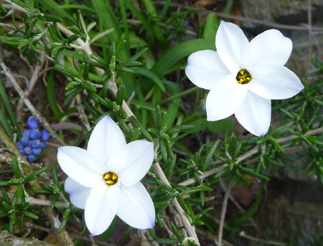 白い小さな花はハナニラ。すっと伸びた細い茎の先にきれいな形の白い花を咲かせます。控えめですが、素朴でとても美しい花です。脇に見えている青い花はムスカリ。