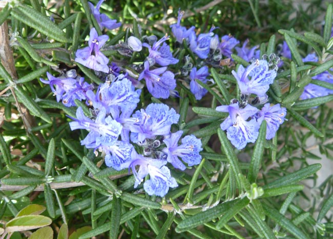 青い花はローズマリーの花。小さな花です。